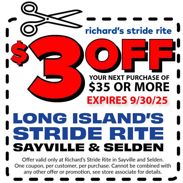 Savings for you! Don't forget your coupon when you visit Richard's Stride Rite in Sayville & Selden!